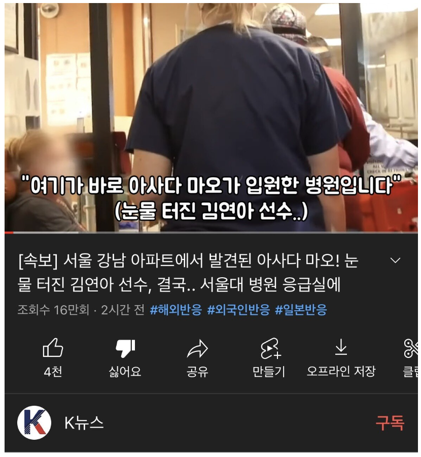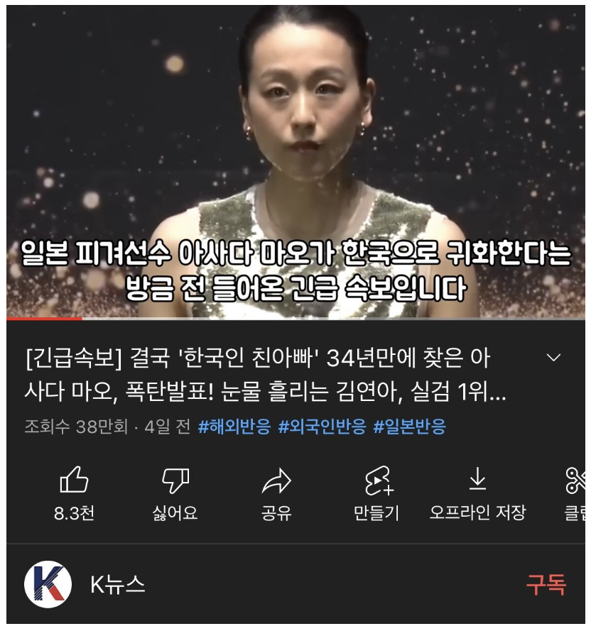한 국뽕뉴스 채널 K뉴스에서 아사다 마오가 죽었다는 완전 허위 뉴스를 발표했습니다.